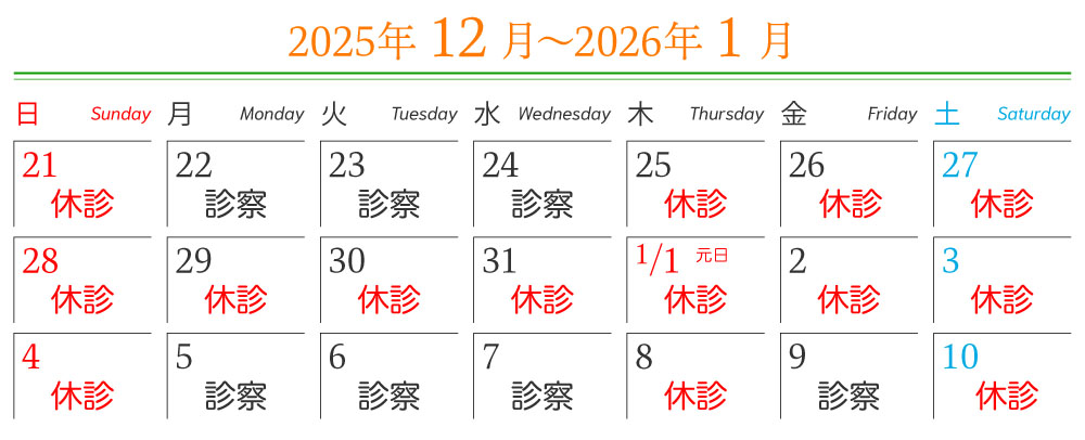 HOME お知らせ 年末年始休診のお知らせ 年末年始休診のお知らせ 2025年12月25日(木)から2026年1月4日(日)まで年末年始の休診とさせていただきます。 1月5日(月)から通常診療いたします。 ご不便をおかけいたしますが、よろしくお願いいたします。